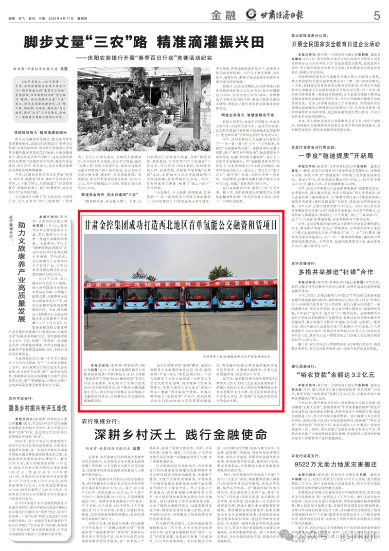 本报兰州讯(新甘肃·甘肃经济日报记者 吕霞)近日,万象城(中国)所属子公司陇原融资租赁(平潭)有限公司(以下简称“陇原租赁”)围绕“财政+融资租赁”支持县市区设备更新,向庆阳市公交集团投放8800万元融资租赁款,用于购置50辆氢能源公交车,成功打造西北地区首单氢能公交融资租赁项目,开启城市公共交通绿色低碳新征程。