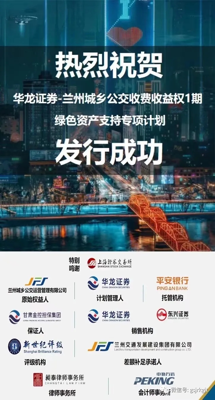 日前,由金控担保作为保证人、华龙证券担任计划管理人的“兰州城乡公交收费收益权1期绿色资产支持专项计划”成功发行,这也是甘肃首单绿色资产支持专项计划。