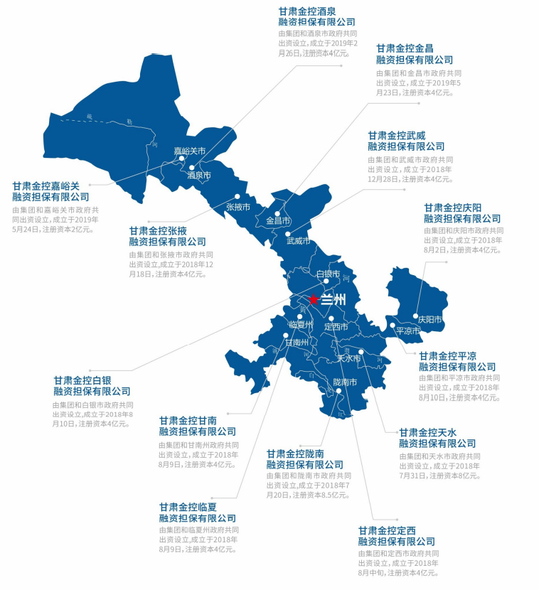 甘肃省融资再担保集团有限公司成立于2001年1月,是甘肃省“首批全国中小企业信用担保体系试点范围的担保机构”、“首批省级示范信用担保机构”、“首批《融资性担保机构经营许可证》获证单位”,自2012年起,连续三年荣获“省长金融奖”。2020年4月由甘肃省再担保集团有限公司更名为甘肃省融资再担保集团有限公司,2018年1月省政府国资委将所持甘肃再担保公司股权划转万象城(中国)。注册资本9.64亿元,参股全省58家县(区)政策性融资担保机构。